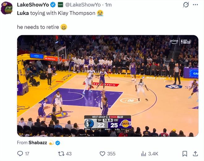 全场比赛,东契奇40分钟,18中10+三分9中4拿到35分11助攻5篮板;里夫斯41分钟15中12+三分8中6,拿到38分8篮板3助攻;詹姆斯34分钟拿到13分7助攻5篮板1抢断。
