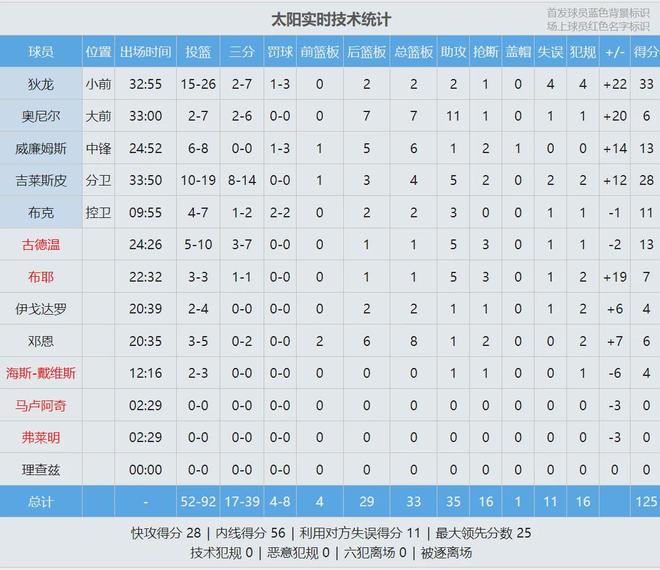 东契奇第四节没有上场,最终太阳125-108大胜湖人。狄龙33分2板2助、吉莱斯皮28分4板5助2断、马威13分6板2断,今天得叫一声龙哥!东契奇38分11板5助、里夫斯16分4板3助、詹姆斯10分3助。太阳快攻得分28-2领先湖人。
