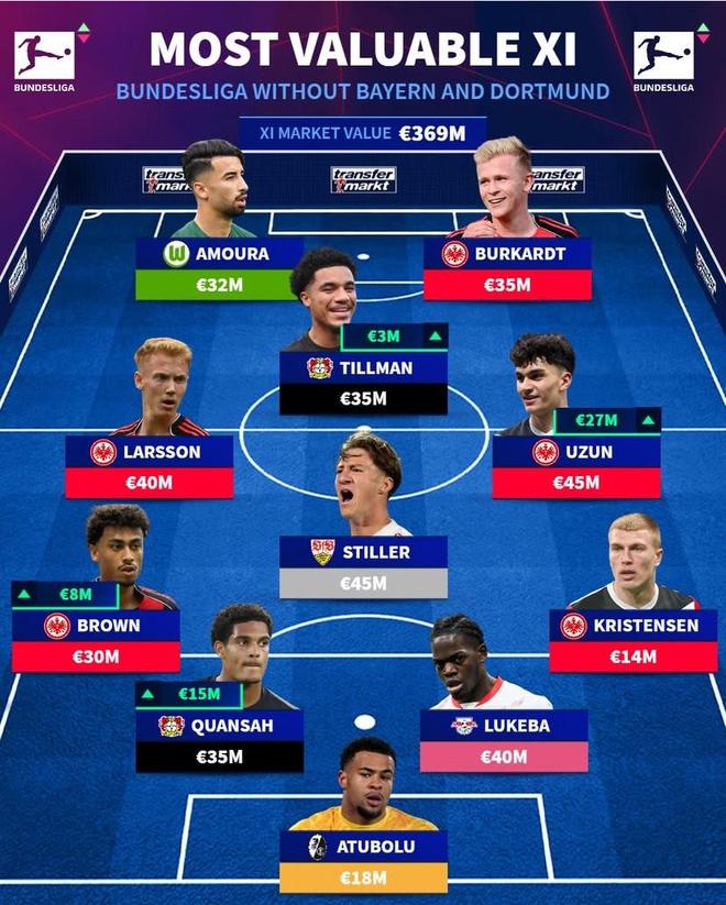 不含拜仁和多特蒙德球员的德甲最贵阵容: